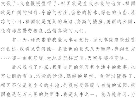 [解析]此题考查学生对选材的把握能力,本文主要表达了对祖国的赞美之情,文中选取典型的事例,从不同方面来表现,这是以小见大的写作手法。据此回答即可。