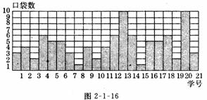 12图2-l-16表示某班21位同学衣服上口袋的数目,若任选一位同学,则其衣服上口袋数目为5的概率是___________.