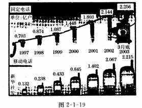 15 据信息产业部2003年4月公布的数字显示,我国固定电话和移动电话用户近年来都有大幅度增加,移动电话用户已接近固定电话用户.根据图2-l-19所示,我国固定电话从_______年至_______年的年增加量最大;移动电话从_______年至_______ 年的年增加量最大.