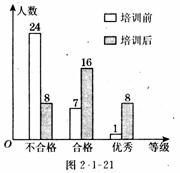 17.(8分)某校初二年级全体320名学生在电脑培训前后各参加了一次水平相同的考试,考分都以同一标准划分成“不合格”、“合格”、‘“优秀”三个等级,为了了解电脑培训的效果,用抽签方式得到其中32名学生的两次考试考分等级,所绘制的统计图如图2-l-21所示.试结合图示信息回答下列问题: