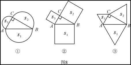 (1) 如图8②,分别以直角三角形ABC三边为边向外作三个正方形,其面积分别用S1、S2、S3表示,那么S1、S2、S3之间有什么关系?(不必证明)