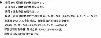 22某商场设计了两种促销方案:第一种是顾客在商场消费每满200元就可以从一个装有100个完全相同的球(球上分别标有数字1,2,……100)的箱子中随机摸出一个球(摸后放回)。若球上的数字是88,则返购物券500元;若球上的数字是11或77,则返购物券300元;若球上的数字能被5整除,则返购物券5元;若是其它数字,则不返购物券。第二种是顾客在商场消费每满200元直接获得购物券15元。估计促销期间将有5000人次参加活动。请你通过计算说明商家选择哪种促销方案合算些?