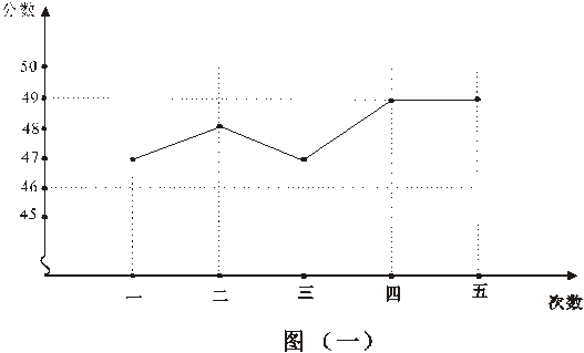 65. (2008云南省)苍洱中学九年级学生进行了五次体育模拟测试,甲同学的测试成绩如表(一),乙同学的测试成绩折线统计图如图(一)所示: