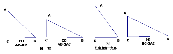 9、如图12,Rt△ABC中,∠C=90°,按题目所给条件及要求将相应的直角三角形,分割成若干个全等的并且分别与原三角形相似的三角形.画出图形并简要说明理由.