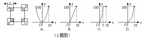 2、如图2,正方形的边长为10,四个全等的小正方形的对称中心分别在正方形的顶点上,且它们的各边与正方形各边平行或垂直.若小正方形的边长为,且,阴影部分的面积为,则能反映与之间函数关系的大致图象是( )