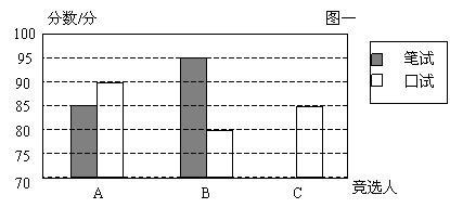 三名大学生竞选系学生会主席,他们的笔试成绩和口试成绩(单位:分)分别用了两种方式进行了统计,如表一和图一: