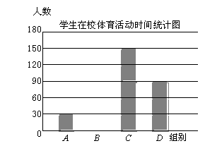 (本小题7分)某地为了解当地推进“阳光体育”运动情况,就“中小学生每天在校体育活动时间”的问题随机调查了300名中小学生.根据调查结果绘制成的统计图的一部分如图(其中分组情况见下表):