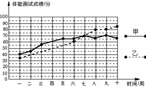 (河北实验区05)如图是连续十周测试甲、乙两名运动员体能训练情况的折线统计图。教练组规定:体能测试成绩70分以上(包括70分)为合格。