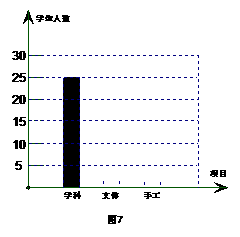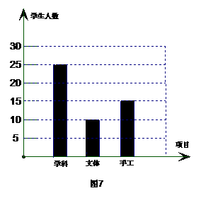 19. (本小题满分8分)某中学计划对本校七年级10个班的480名学生按“学科”、“文体”、“手工”三个项目安排课外兴起小组,小组小明从每个班中随机抽取5名学生进行问卷调查,并将统计结果制成如下所示的表和图7.
