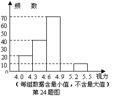 24.(本小题满分7分) .某区对参加2010年中考的5000名初中毕业生进行了一次视力抽样调查,绘制出频分布表和频数分布直方图的一部分.请根据图表信息回答下列问题: