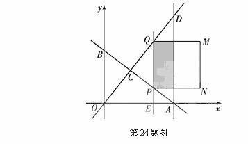 如图,直线分别与x轴、y轴交于A、B两点;直线与AB交于点C,与过点A且平行于y轴的直线交于点D.点E从点A出发,以每秒1个单位的速度沿x轴向左运动.过点E作x轴的垂线,分别交直线AB、OD于P、Q两点,以PQ为边向右作正方形PQMN.设正方形PQMN与△ACD重叠部分(阴影部分)的面积为S(平方单位),点E的运动时间为t(秒).