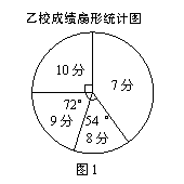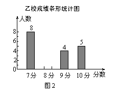 (1)在图1中,“7分”所在扇形的圆心角等于 度;甲校成绩统计表中得分为9分的人数是 .求出乙校的参赛人数,并将图2的统计图补充完整.
