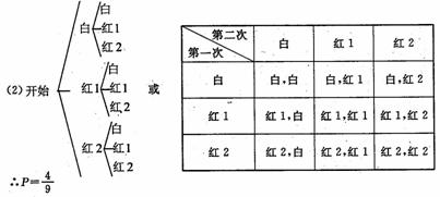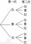 6. (2011宁波市,20,6分)在一个不透明的袋子中装有3个除颜色外完全相同的小球,其中白球1个,黄球1个,红球1个,摸出一个球记下颜色后放回,再摸出一个球,请用列表或树形图法求两次都摸到红球的概率.