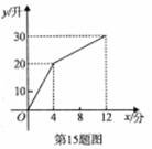 34. (2011湖北武汉市,15,3分)一个装有进水管和出水管的容器,从某时刻起只打开进水管进水,经过一段时间,再打开出水管放水.至12分钟时,关停进水管.在打开进水管到关停进水管这段时间内,容器内的水量y(单位:升)与时间x(单位:分钟)之间的函数关系如图所示.关停进水管后,经过_____分钟,容器中的水恰好放完.