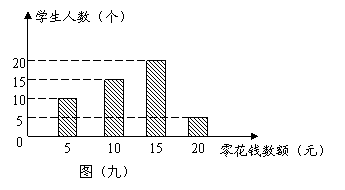 21.某教师为了对学生零花钱的使用进行教育指导,对全班50名学生每人一周内的零花钱数额进行了调查统计,并绘制了统计表及如图(九)所示的统计图.