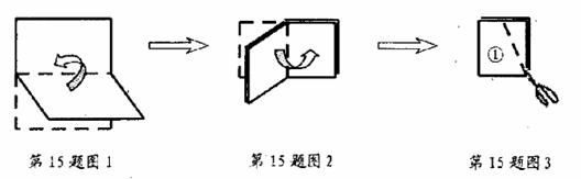 2. (2011浙江绍兴,15,5分) 取一张矩形纸片按照图1、图2中的方法对折,并沿图3中过矩形顶点的斜线(虚线)剪开,那剪下的①这部分展开,平铺在桌面上,若平铺的这个图形是正六边形,则这张矩形纸片的宽和长之比为 .