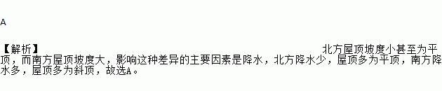 A 【解析】北方屋顶坡度小甚至为平顶,而南方屋顶坡度大,影响这种差异的主要因素是降水,北方降水少,屋顶多为平顶,南方降水多,屋顶多为斜顶,故选A。