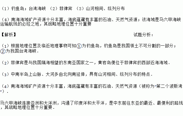 £¨1£©µöÓ㵺£»Ì¨Í庣Ͽ £¨2£©·ÆÂɱö £¨3£©É½ºÓÏà¼ä¡¢×ÝÁзֲ¼ £¨4£©ÄϺ£º£Óò¿ó²ú×ÊÔ´Ê®·Ö·á¸»£¬º£µ×Ô̲ØÓзḻµÄʯÓÍ¡¢ÌìÈ»Æø×ÊÔ´£»¸Ãº£ÓòÊÇÂíÁù¼×º£Ï¿ÔËÊ亽Ïߵıؾ֮µØ£¬ÆäÕ½ÂÔµØÀíλÖÃÊ®·ÖÖØÒª ¡¾½âÎö¡¿ÊÔÌâ·ÖÎö£º £¨1£©¸ù¾ÝµØÀíλÖü°ÁÙ½üµØÀíÊÂÎï¿ÉÖª¢ÙΪµöÓ㵺£¬µöÓ㵺ÊÇÎÒ¹úÁìÍÁ²»¿É·Ö¸îµÄÒ»²¿·Ö£»¢ÚΪÎÒ¹ų́Í庣Ͽ£® £¨2£©·ÆÂɱöÊÇÓëÎÒ¹ú¸ôº£ÏàÍûµÄ¶«ÄÏÑǹú¼ÒÖ®Ò»£¬»ÆÑÒµº±ãλÓÚ·ÆÂÉ...
