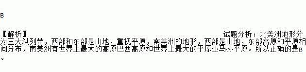 B 【解析】试题分析:北美洲地形分为三大纵列带,西部和东部是山地,重视平原,南美洲的地形,西部是山地,东部高原和平原相间分布,南美洲有世界上最大的高原巴西高原和世界上最大的平原亚马孙平原。所以正确的是B。