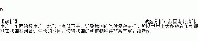 D 【解析】试题分析:我国南北跨纬度广,东西跨经度广,地形上高低不平,导致我国的气候复杂多样,所以世界上大多数农作物都能在我国找到合适生长的地区,使得我国的动植物种类非常丰富,故选D.
