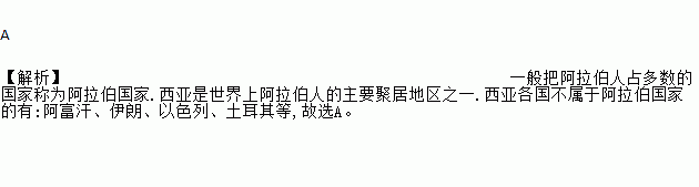 A 【解析】一般把阿拉伯人占多数的国家称为阿拉伯国家.西亚是世界上阿拉伯人的主要聚居地区之一.西亚各国不属于阿拉伯国家的有:阿富汗、伊朗、以色列、土耳其等,故选A。