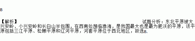 B 【解析】试题分析:东北平原被大兴安岭、小兴安岭和长白山半包围,在西南处濒临渤海,是我国最大也是最为肥沃的平原,该平原包括三江平原、松嫩平原和辽河平原,河套平原位于西北地区,故选B.