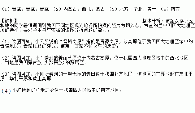 £¨1£©Çà²Ø£¬Çà²Ø£¬Çà²Ø £¨2£©ÄÚÃɹţ¬Î÷±±£¬ÃɹŠ£¨3£©±±·½£¬»ª±±£¬»ÆÍÁ £¨4£©ÄÏ·½ ¡¾½âÎö¡¿ÕûÌå·ÖÎö£º¸ÃÌâÒÔ¶ÁÐ¡ÔÆºÍËýµÄͬѧÊî¼ÙÆÚ¼äµ½ÎÒ¹ú²»Í¬µØÇø¹Û¹âÂÃÓÎËùÅÄÉãµÄÕÕÆ¬ÎªÇÐÈëµã£¬¿¼²éµÄÊÇÖйúËÄ´óµØÀíÇøÓòµÄÌØÕ÷£¬ÒªÇóѧÉú¾ßÓнÏÇ¿µÄ¶Áͼ·ÖÎöÎÊÌâµÄÄÜÁ¦¡£ £¨1£©¶Áͼ¿ÉÖª£¬Ð¡ÔÆËù˵µÄ¡°Ñ©Óò¸ßÔ¡±Ö¸µÄÊÇÇà²Ø¸ßÔ£¬¸Ã¸ßÔλÓÚÎÒ¹úËÄ´óµØÀíÇøÓòÖеÄÇà²ØµØÇø¡£Çà²ØÌú·µÄ½¨³É£¬½áÊøÁËÎ÷²Ø²»Í¨»ð³µµÄÀúÊ·¡£ ...