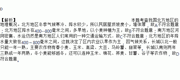 D 【解析】本题考查我国北方地区的地理概况。北方地区冬季气候寒冷、降水较少,所以民居屋顶坡度小,墙体厚,故A不符合题意;北方地区降水在400--800毫米之间,多旱地,以小麦种植为主,故B不符合题意;南方地区河网密集、水运仍然是南方地区人们常用的一种交通运输方式.故C不符合题意;北方地区的年降水量大致在400~800毫米之间,这就决定了区内农业以旱作为主,因气候关系,长城以北一般只能一年一熟...