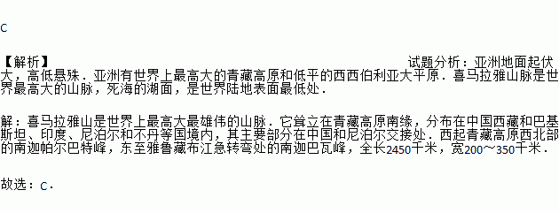 C ¡¾½âÎö¡¿ÊÔÌâ·ÖÎö£ºÑÇÖÞµØÃæÆð·ü´ó£¬¸ßµÍÐüÊ⣮ÑÇÖÞÓÐÊÀ½çÉÏ×î¸ß´óµÄÇà²Ø¸ßÔºÍµÍÆ½µÄÎ÷Î÷²®ÀûÑÇ´óƽԣ®Ï²ÂíÀÑÅɽÂöÊÇÊÀ½ç×î¸ß´óµÄɽÂö£¬ËÀº£µÄºþÃæ£¬ÊÇÊÀ½ç½µØ±íÃæ×îµÍ´¦£® ¡¾½âÎö¡¿ ϲÂíÀÑÅɽÊÇÊÀ½çÉÏ×î¸ß´ó×îÐÛΰµÄɽÂö£®ËüËÊÁ¢ÔÚÇà²Ø¸ßÔÄÏÔµ£¬·Ö²¼ÔÚÖйúÎ÷²ØºÍ°Í»ù˹̹¡¢Ó¡¶È¡¢Äá²´¶ûºÍ²»µ¤µÈ¹ú¾³ÄÚ£¬ÆäÖ÷Òª²¿·ÖÔÚÖйúºÍÄá²´¶û½»½Ó´¦£®Î÷ÆðÇà²Ø¸ßÔÎ÷±±²¿µÄÄÏåÈÅÁ¶û°ÍÌØ·å£¬¶«ÖÁÑų²Ø²¼½¼±×ªÍä´¦µÄ...