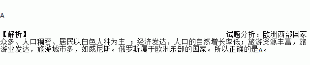 A 【解析】试题分析:欧洲西部国家众多、人口稠密、居民以白色人种为主 ;经济发达,人口的自然增长率低;旅游资源丰富,旅游业发达,旅游城市多,如威尼斯。俄罗斯属于欧洲东部的国家。所以正确的是A。