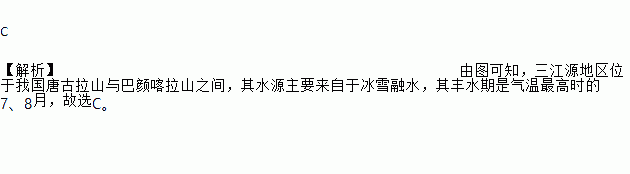 C 【解析】由图可知,三江源地区位于我国唐古拉山与巴颜喀拉山之间,其水源主要来自于冰雪融水,其丰水期是气温最高时的7、8月,故选C。