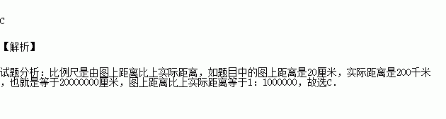 实地距离为200千米,图上距离为20厘米,该图的比例尺为