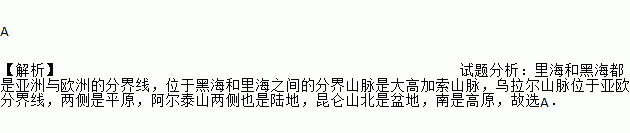 A 【解析】试题分析:里海和黑海都是亚洲与欧洲的分界线,位于黑海和里海之间的分界山脉是大高加索山脉,乌拉尔山脉位于亚欧分界线,两侧是平原,阿尔泰山两侧也是陆地,昆仑山北是盆地,南是高原,故选A.