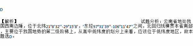 D 【解析】试题分析:云南省地处我国西南边陲,位于北纬21°8’32’’-29°15’8’,’东经97°31’39’’-106°11’47’’之间,北回归线横贯本省南部,主要位于我国地势的第二级阶梯上,从高中低纬度的划分上来看,应该位于低纬度地区,故本题选D。