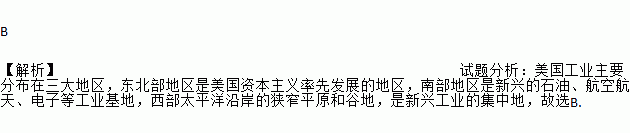 B 【解析】试题分析:美国工业主要分布在三大地区,东北部地区是美国资本主义率先发展的地区,南部地区是新兴的石油、航空航天、电子等工业基地,西部太平洋沿岸的狭窄平原和谷地,是新兴工业的集中地,故选B.