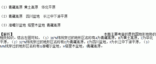 (1)写出36°N纬线穿过的地形区名称:A__________,B__________,C__________