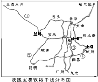 (1)我国铁路干线纵横交错、四通八达,在主要的铁路干线交汇处形成重要的交通枢纽.江苏的徐州是我国重要的交通枢纽之一,在此经过的铁路干线中东西走向的是兰州到连云港的陇海铁路,南北走向的是北京到上海的京沪铁路.上海位于京沪线与沪昆线交界处.兰州位于陇海线、包兰线、兰新线和兰青线交汇处.