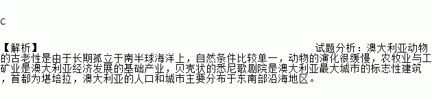 C ¡¾½âÎö¡¿ÊÔÌâ·ÖÎö£º°Ä´óÀûÑǶ¯ÎïµÄ¹ÅÀÏÐÔÊÇÓÉÓÚ³¤ÆÚ¹ÂÁ¢ÓÚÄϰëÇòº£ÑóÉÏ£¬×ÔÈ»Ìõ¼þ±È½Ïµ¥Ò»£¬¶¯ÎïµÄÑÝ»¯ºÜ»ºÂý£¬Å©ÄÁÒµÓ빤¿óÒµÊǰĴóÀûÑǾ¼Ã·¢Õ¹µÄ»ù´¡²úÒµ£¬±´¿Ç×´µÄϤÄá¸è¾çÔºÊǰĴóÀûÑÇ×î´ó³ÇÊеıêÖ¾ÐÔ½¨Öþ£¬Ê×¶¼Îª¿°ÅàÀ£¬°Ä´óÀûÑǵÄÈ˿ںͳÇÊÐÖ÷Òª·Ö²¼ÓÚ¶«Äϲ¿Ñغ£µØÇø¡£
