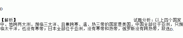 D 【解析】试题分析:以上四个国家中,地跨两大洲,濒临三大洋、且兼跨寒、温、热三带的国家是美国,中国全部位于亚洲,只濒临太平洋,也没有寒带;日本全部位于亚洲,没有寒带和热带,俄罗斯没有跨热带,故选D.
