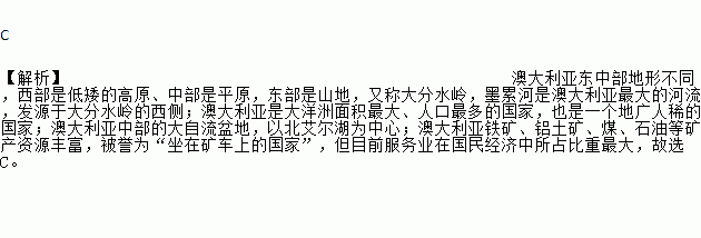 C 【解析】澳大利亚东中部地形不同,西部是低矮的高原、中部是平原,东部是山地,又称大分水岭,墨累河是澳大利亚最大的河流,发源于大分水岭的西侧;澳大利亚是大洋洲面积最大、人口最多的国家,也是一个地广人稀的国家;澳大利亚中部的大自流盆地,以北艾尔湖为中心;澳大利亚铁矿、铝土矿、煤、石油等矿产资源丰富,被誉为“坐在矿车上的国家”,但目前服务业在国民经济中所占比重最大,故选C。