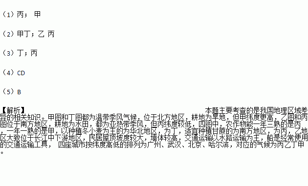 (5)如果四图分别代表四座城市广州、武汉、北京、哈尔滨,则其对应关系正确的是(________)A.甲北京 乙武汉 丙广州 丁哈尔滨 B.甲哈尔滨 乙武汉 丙广州 丁北京 C.甲哈尔滨 乙广州 丙武汉 丁北京 D.甲北京 乙广州 丙武汉 丁哈尔滨