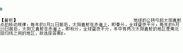 B 【解析】地球的公转引起太阳直射点的移动规律:每年的3月21日前后,太阳直射在赤道上,即春分,全球昼夜平分;每年的9月23日前后,太阳又直射在赤道上,即秋分,全球昼夜平分,年中有两次太阳直射的地区是南北回归线之间的地区,故选择答案B。