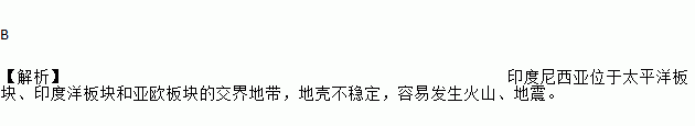 B 【解析】印度尼西亚位于太平洋板块、印度洋板块和亚欧板块的交界地带,地壳不稳定,容易发生火山、地震。