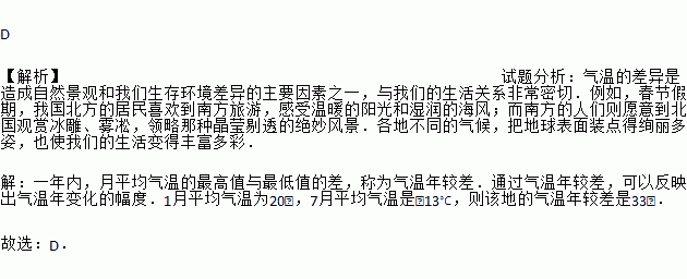 D 【解析】试题分析:气温的差异是造成自然景观和我们生存环境差异的主要因素之一,与我们的生活关系非常密切.例如,春节假期,我国北方的居民喜欢到南方旅游,感受温暖的阳光和湿润的海风;而南方的人们则愿意到北国观赏冰雕、雾凇,领略那种晶莹剔透的绝妙风景.各地不同的气候,把地球表面装点得绚丽多姿,也使我们的生活变得丰富多彩. 【解析】 一年内,月平均气温的最高值与最低值的差,称为气温年较差....
