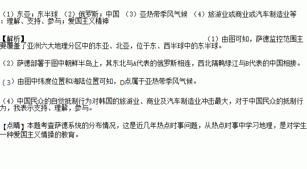 (2)萨德部署于图中朝鲜半岛上,其东北与A (国家)相连,西北隔鸭绿江与B (国家)相接。