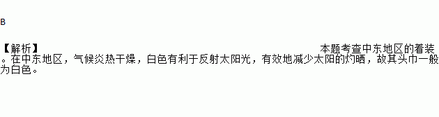 B 【解析】本题考查中东地区的着装。在中东地区,气候炎热干燥,白色有利于反射太阳光,有效地减少太阳的灼晒,故其头巾一般为白色。