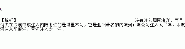 C 【解析】没有注入周围海洋,而是消失在沙漠中或注入内陆湖泊的是塔里木河,它是亚洲著名的内流河;湄公河注入太平洋,印度河注入印度洋,黄河注入太平洋.