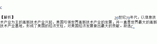 C 【解析】20世纪70年代,以信息技术产业为主的高新技术产业兴起,美国引领世界高新技术产业的发展,并一直是世界最大的高新技术产业基地,形成了美国的经济支柱,对美国经济发展做出最大的贡献。故选C。