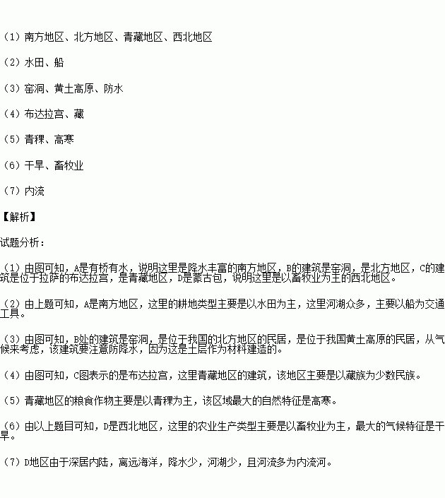 (3)B图建筑物的名称是____,主要分布在_____,该地区建筑房屋从气候考虑,要注重________。