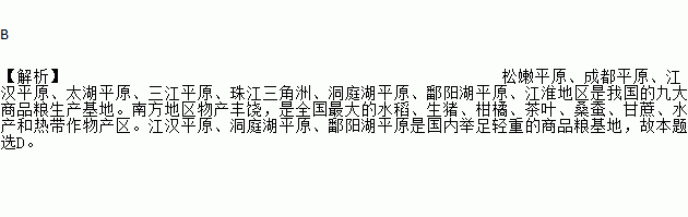 B 【解析】松嫩平原、成都平原、江汉平原、太湖平原、三江平原、珠江三角洲、洞庭湖平原、鄱阳湖平原、江淮地区是我国的九大商品粮生产基地。南方地区物产丰饶,是全国最大的水稻、生猪、柑橘、茶叶、桑蚕、甘蔗、水产和热带作物产区。江汉平原、洞庭湖平原、鄱阳湖平原是国内举足轻重的商品粮基地,故本题选D。